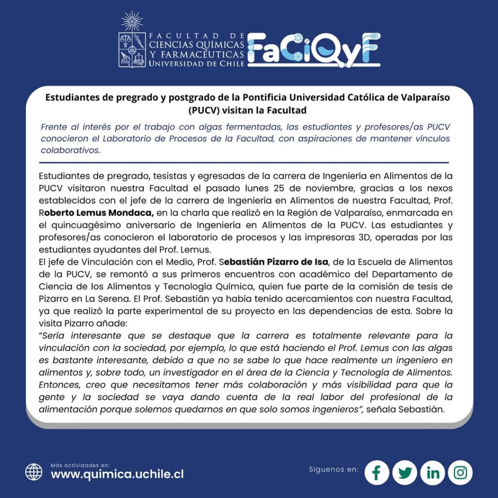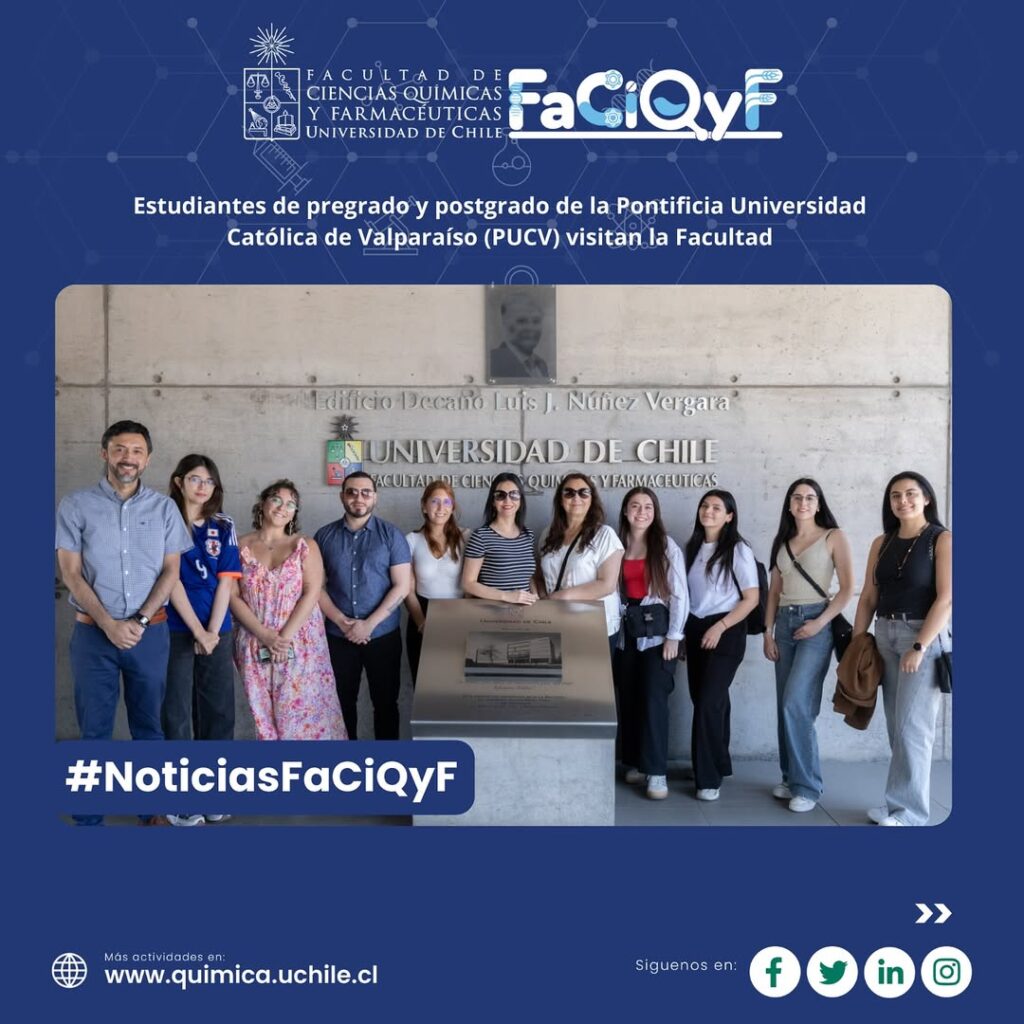 Un grupo de estudiantes de la carrera de Ingeniería en Alimentos de la Pontificia Universidad Católica de Valparaíso (PUCV) visitó la Facultad de Ciencias Químicas y Farmacéuticas (FaCiQyF) de la Universidad de Chile, en el marco de actividades de vinculación que buscan fortalecer el intercambio académico y la proyección profesional de los futuros ingenieros en alimentos.