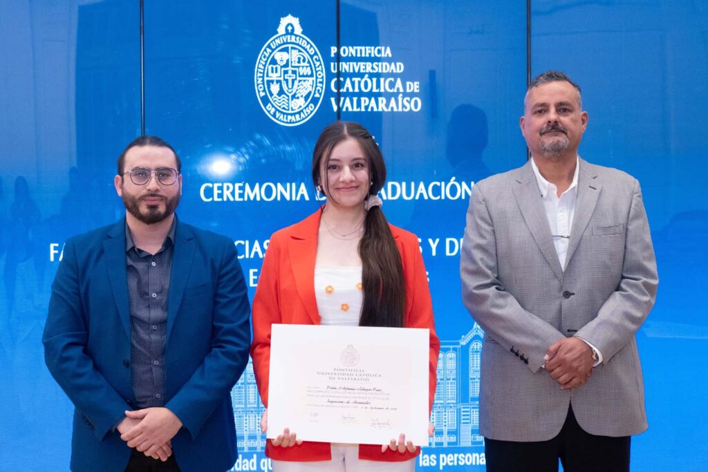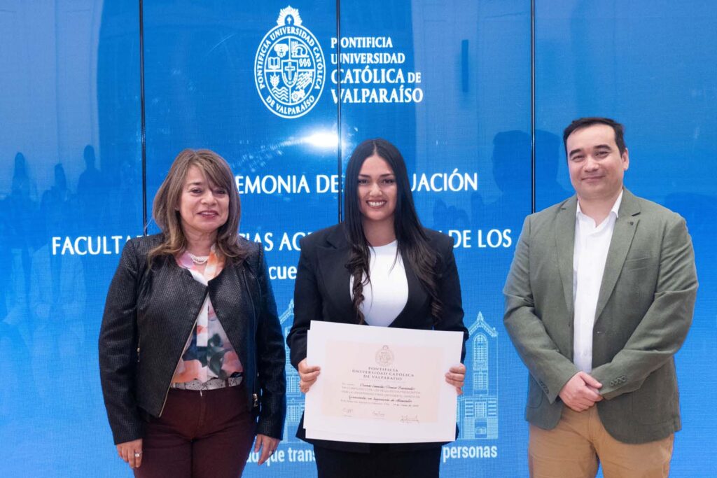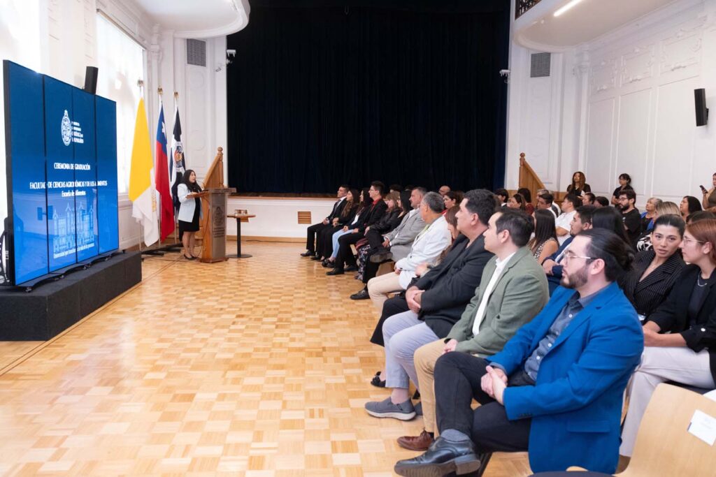 El acto estuvo acompañado por autoridades de la casa de estudios, incluyendo al Padre Jorge Romero y al Sr. Orlando de la Vega Luna, director general de Asuntos Internacionales, en representación del rector. Durante la ceremonia se reconoció a los mejores titulados, destacando a la Srta. Belén Villegas y al Sr. Óscar Cavieres, quien además pronunció un discurso y recibió el Premio Alumni PUCV. La actividad fue un espacio dedicado especialmente a los egresados y sus familias, celebrando los logros académicos y el cierre de una etapa fundamental en su formación profesional.