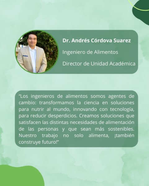 «Los ingenieros de alimentos somos agentes de cambio: transformamos la ciencia en soluciones para nutrir al mundo, innovando con tecnología, para reducir desperdicios. Creamos soluciones que satisfacen las distintas necesidades de alimentación de las personas y que sean más sostenibles. Nuestro trabajo no solo alimenta, ¡también construye futuro!»