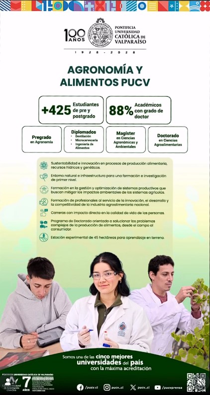 Asimismo, la publicación puso en valor la oferta de formación continua y de posgrado. Desde la Escuela de Alimentos PUCV se imparten diplomados especializados en destilación, microcervecería e ingeniería de alimentos, mientras que la Escuela de Agronomía PUCV ofrece el Magíster en Ciencias Agronómicas y Ambientales. En paralelo, académicos de ambas unidades participan activamente en el Doctorado en Ciencias Agroalimentarias, promoviendo un enfoque interdisciplinario para abordar los desafíos actuales del sector.